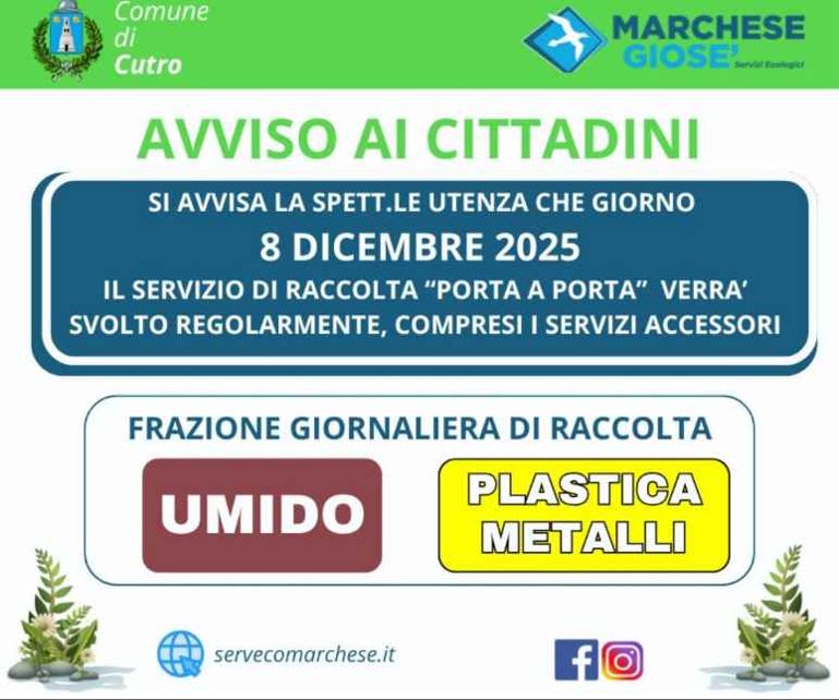 Il servizio di raccolta”Porta a Porta” verra’ svolto regolarmente anche giorno 8 Dicembre- Frazione giornaliera di raccolta
